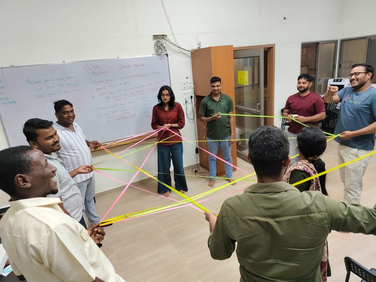 By the end of the exercise, the group was connected by a web of string.