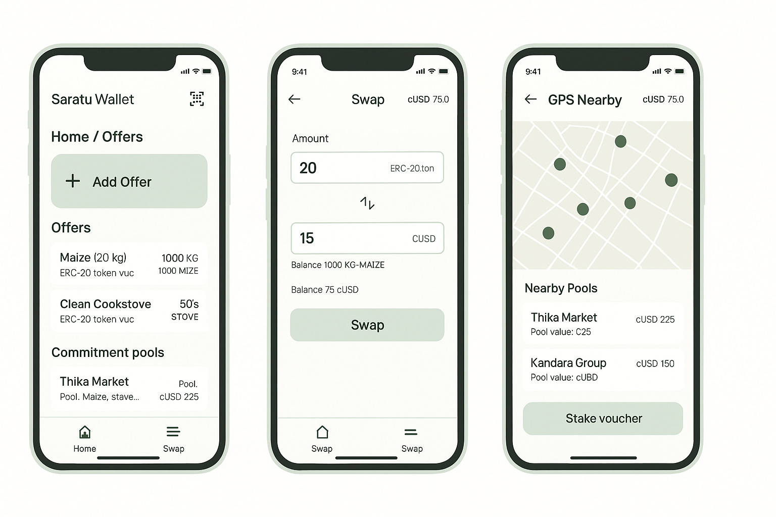In Kilifi, a school, a grocer, and a community clinic each list what they offer as ERC-20 vouchers: tuition & meals (SCHOOL), staples by weight (FOOD), and consultations & meds (CARE). They stake a seed of their own vouchers into the Kilifi Bio-Region Commitment Pool and set what they’ll accept in return (cUSD and selected local vouchers).